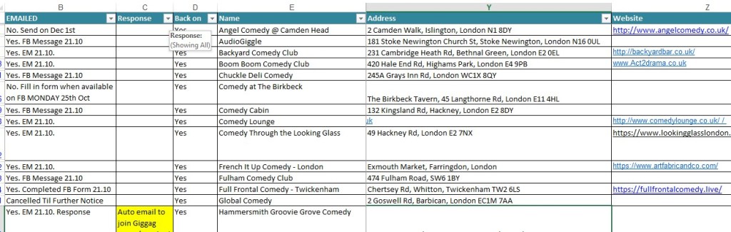 I finally braved the Stand-Up Comedy circuit planner and downloaded the “guide to getting gigs.” An AMAZINGLY comprehensive spreadsheet in Excel of seemingly ALL the comedy gigs in the UK. Contact details, email addresses, details on who they want, open spots or pros etc, links to Facebook pages and such.