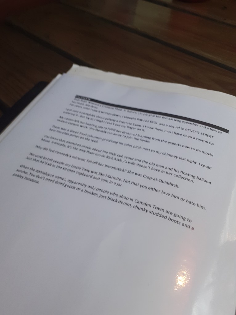 In fact, now I’m doing this course, I have become – to no extent at all – a bit of a comedy writer because I now have to think of jokes and write them down. Every time a gag or pun or idea comes to mind, as I have mentioned below, I now thumb it into my phone. This has helped me get a sense of my productivity with this stuff. I’m probably doing one full joke or idea a day. Which is hardly Monkhousian. Or even Allenesque. But I am surprised how often I’m scrolling through the phone while on the loo thinking “blimey, that was a good batch.” What a horrible image. Especially if I’m facing the wrong way on the toilet…