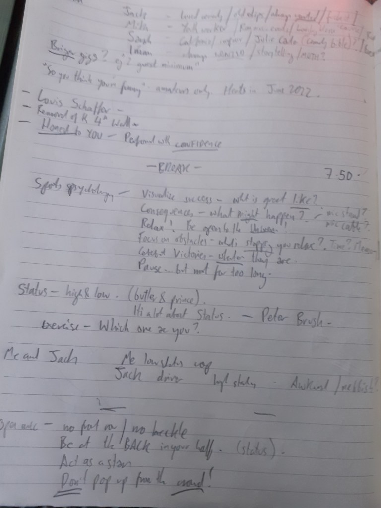 Next we all spoke about what stand up “means” to us. Went around the room. Many thoughts. I said it was a form of therapy, a way of getting attention, a way of proving myself against the high-bar set by my heroes. A desire to share that moment. Talked about how I would obsessively learn bits of stand-up the way others learned songs. That way I could recite them at school for laffs. Or just keep myself amusing muttering them to myself on walks and shopping trips.
